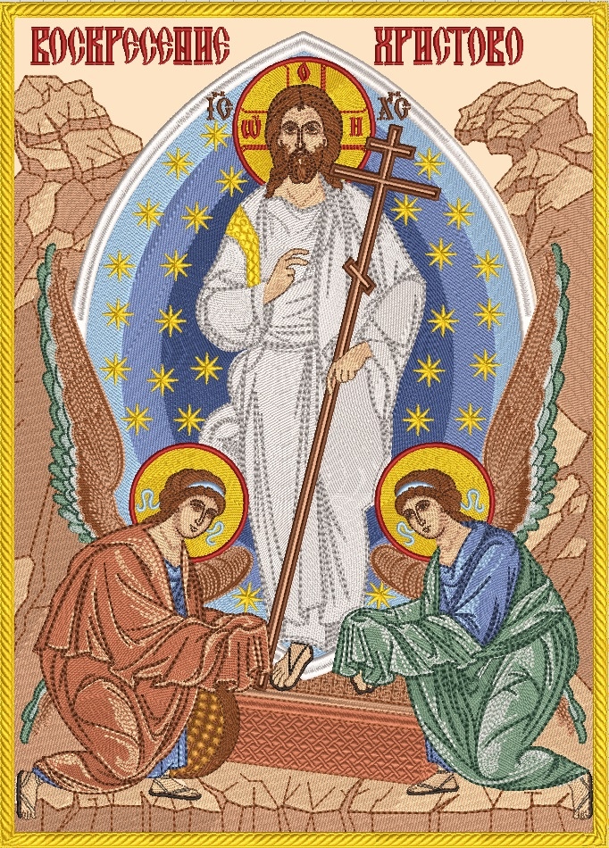 Вышитая икона "Воскресение Христово" Авторский дизайн. Размер 36х26 см, Вышивка вискозой, фон,нимбы -металликом. Подходит для хоругвей. По желанию заказчика размер иконы можем изменить.