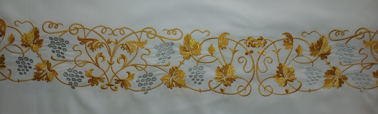 Подризник. Ткань: "кашибо". Цвет белый. Отделка галуном - белый с золотом. Возможна отделка галун+бахрома. Фурнитура золотого цвета в ассортименте.