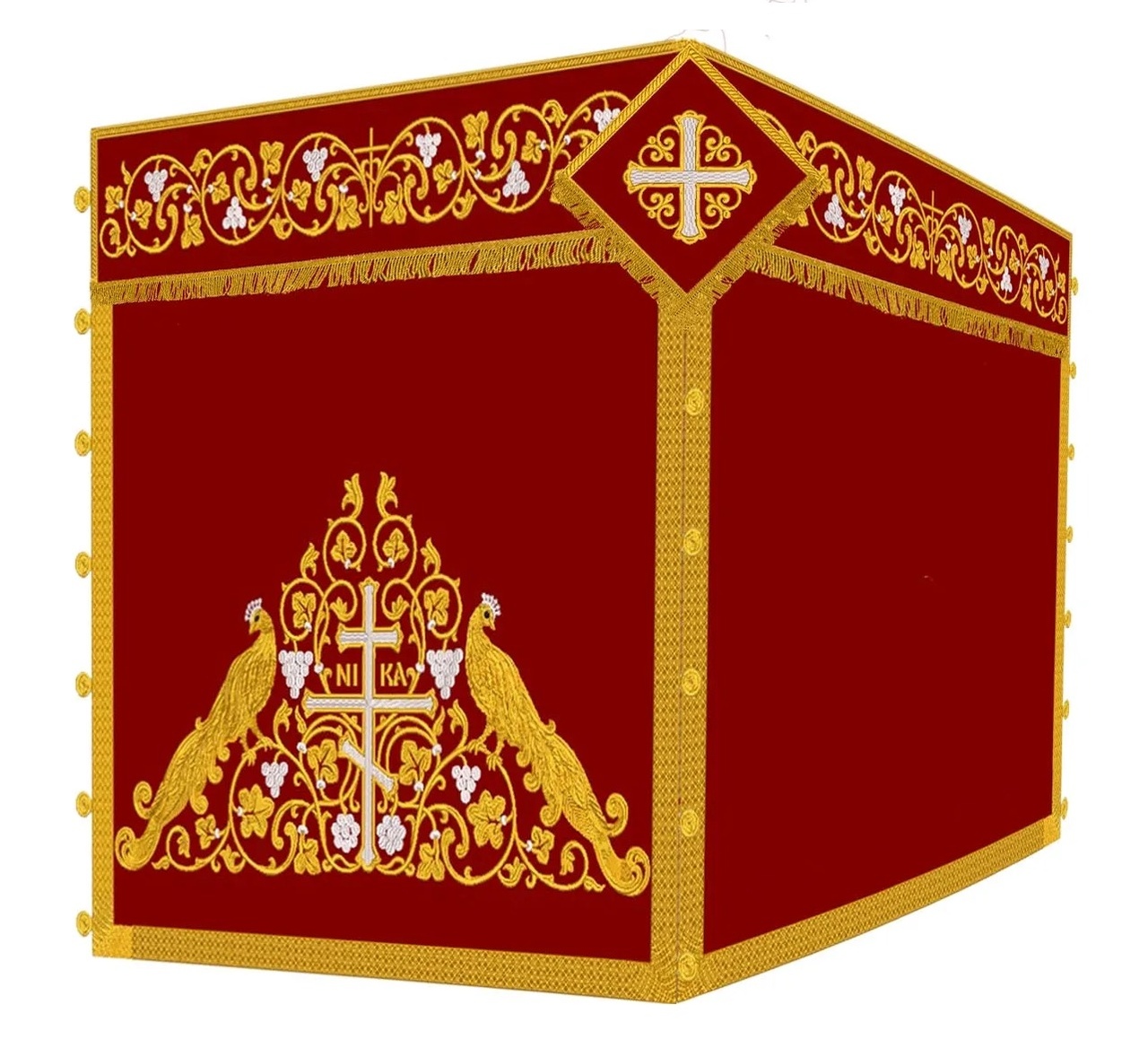 Облачение на престол или жертвенник: отделка галуном,4 застежки. Пелена обшита галуном и крученой бахромой. Цвет: красный с золотом. Рисунок ткани в ассортименте.