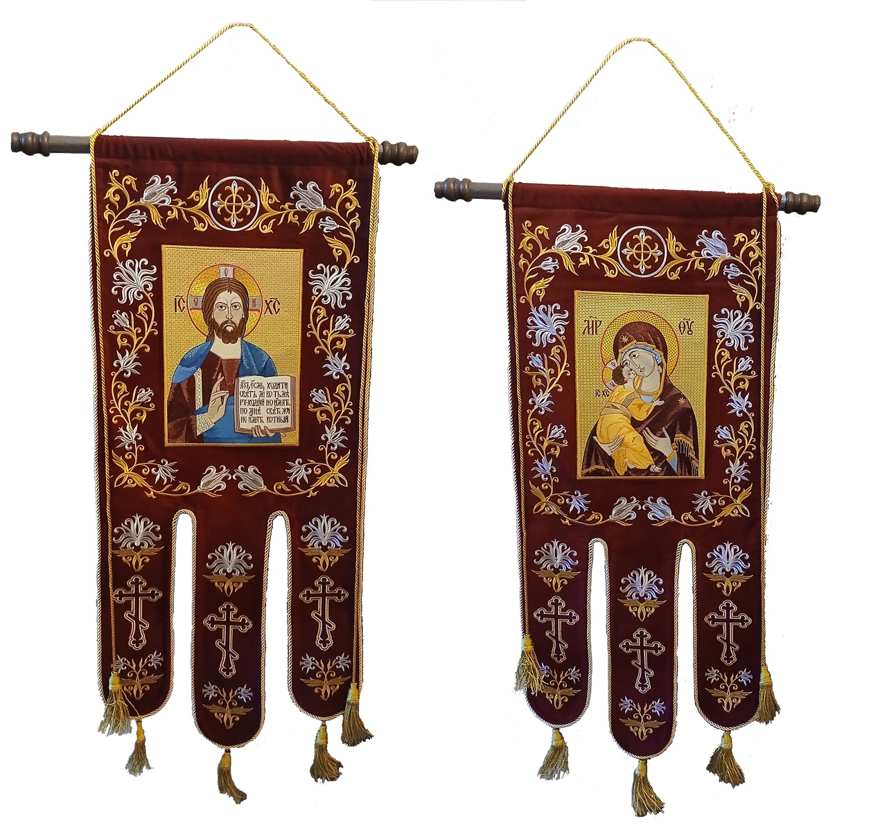 Хоругви. 100% вышивка!!! Цена за пару!!! Иконы полностью вышитые. Машинная вышивка. Авторский дизайн. Орнамент -машинная вышивка на бархате или безворсовой ткани(на выбор) МЕТАЛЛИКОМ.